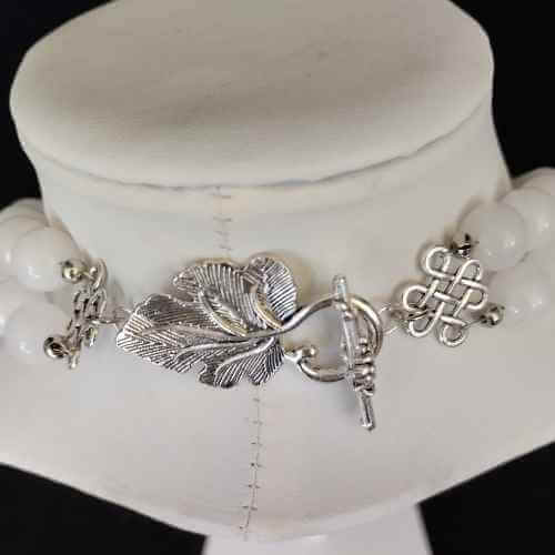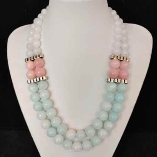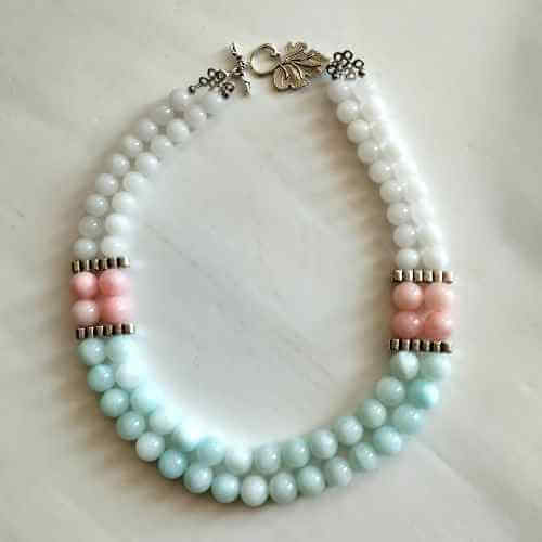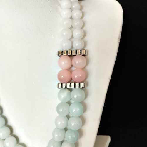 Collar de dos sartas realizado con cuentas de calcedonia azul de 12 mm, cuarzo rosa de 12 mm y ágata blanca de 10 mm.
