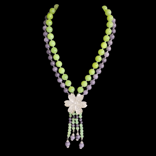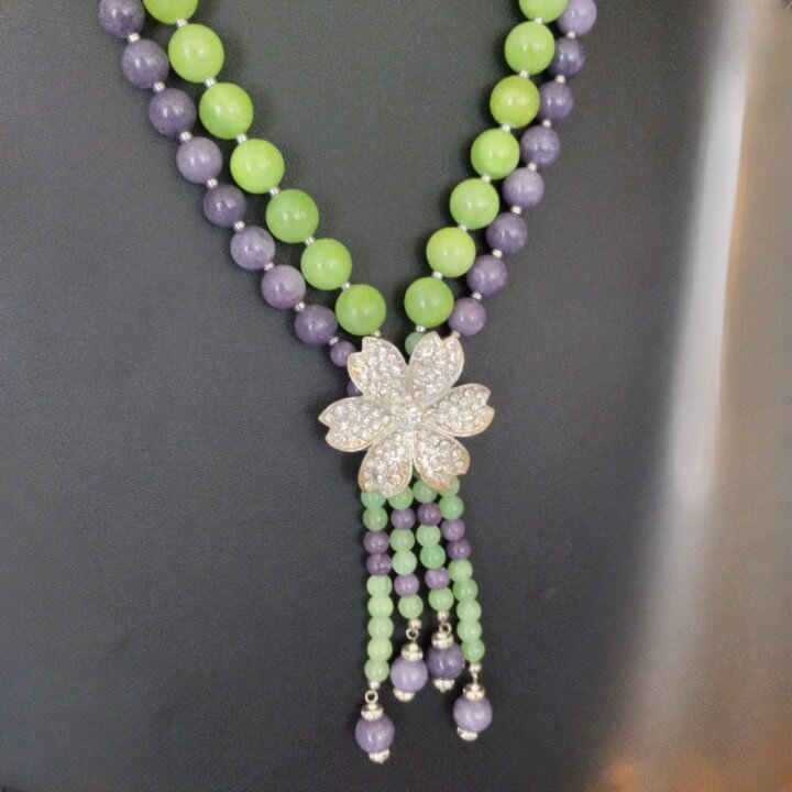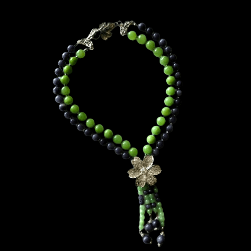 Collar de 2 vueltas realizado con cuentas de ágata verde de 12 mm y de angelita de 10 mm, tiene un adorno de flor de bisutería.