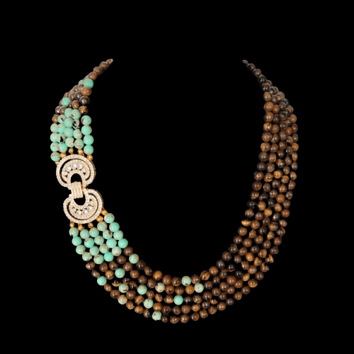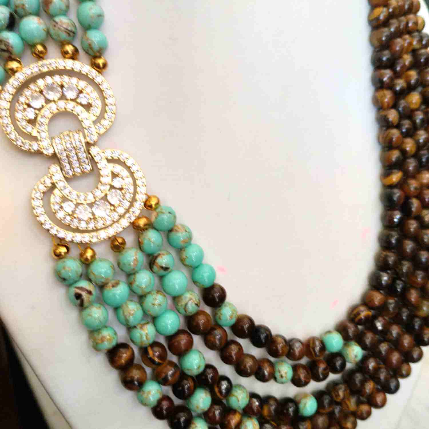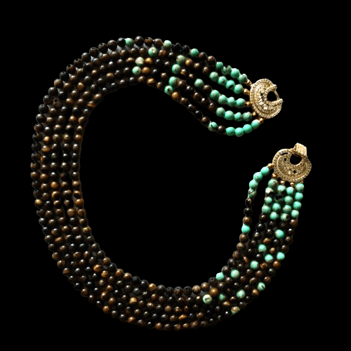 Collar de 5 vueltas realizado con cuentas de 6 mm de ojo de tigre y nácar (teñido en azul).
