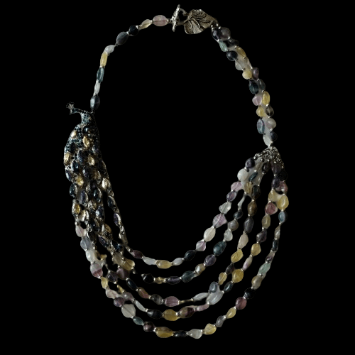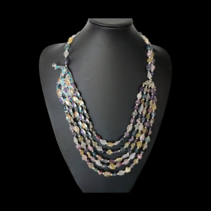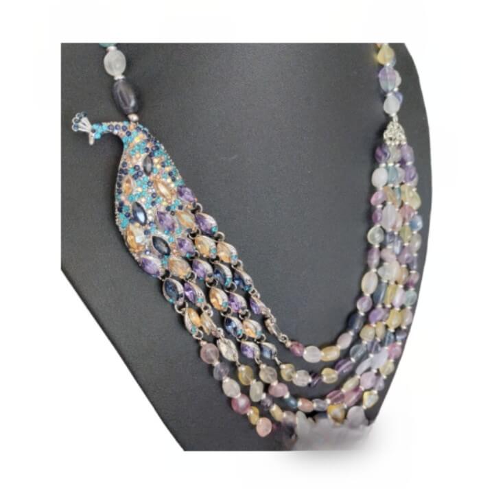 Espectacular collar compuesto por un bonito adorno de bisutería de pavo real y cuentas irregulares de turmalina de 8 -10 mm .