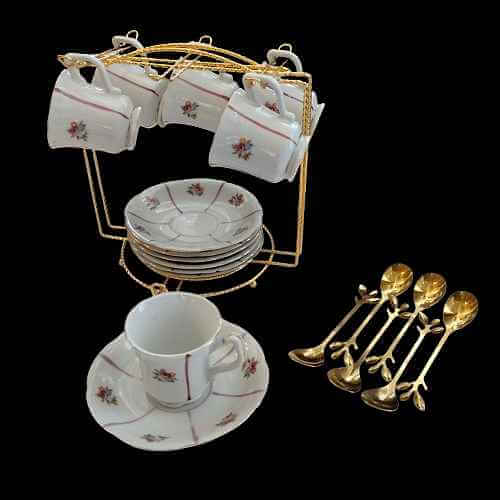 Juego de café compuesto por: 6 tazas, 6 platos, 6 cucharillas doradas y organizador metal dorado.