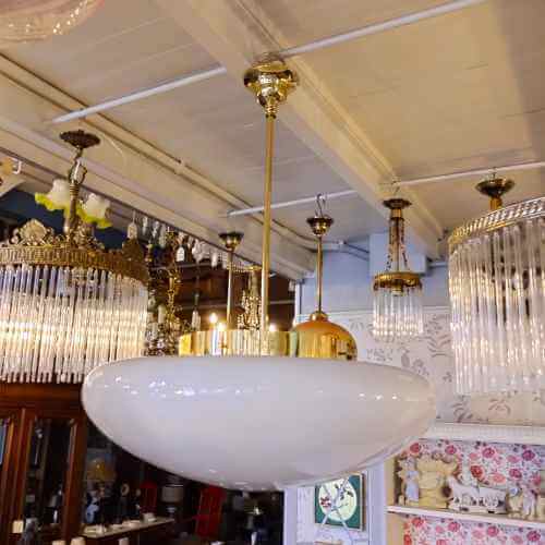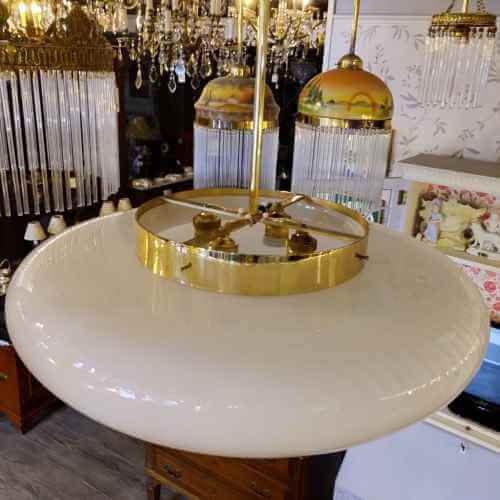 Realizada con cuerpo de bronce y globo de cristal de opalina blanca con forma lenticular,