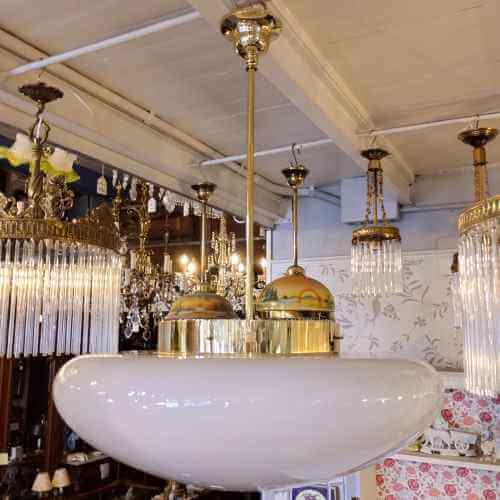 Restaurada, bronce pulido y barnizado, sistema eléctrico renovado.