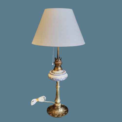 Antigua lámpara de aceite reconvertida a eléctrica, lleva una bombilla E27 (no incluida), interruptor de cadena en el portalámparas.