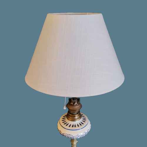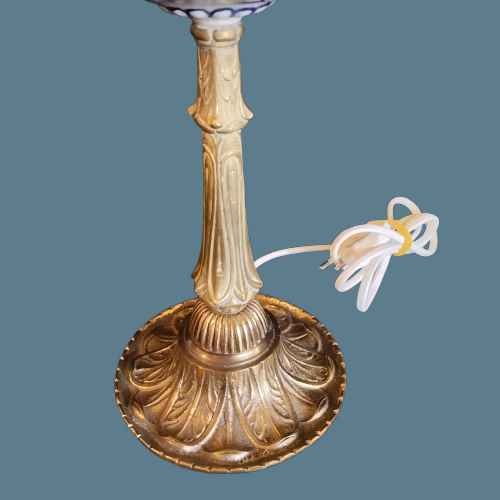 Realizado con cuerpo de bronce y depósito de cerámica blanca y azul, pantalla de tela a estrenar.