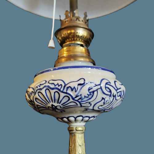 LÁMPARA QUINQUÉ DE CERAMICA Y BRONCE