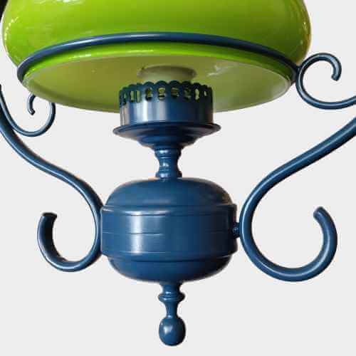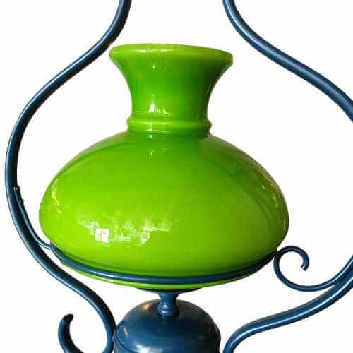 Realizado con cuerpo de bronce en forma de lira patinado en azul oscuro, lleva una tulipa de opalina verde.